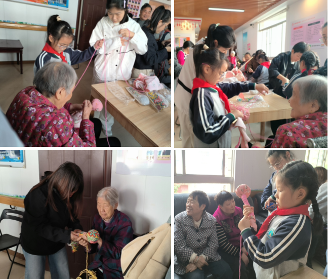 随后,老人、大学生、小学生“三代人”围坐在一起,共同体验中医药文化的魅力。大手牵小手,共制“长寿锤”。小朋友们在爷爷奶奶地指导下,认真地捆扎着布包。大家一边制作,一边交流,现场弥漫着淡淡的艾草香和浓浓的亲情。