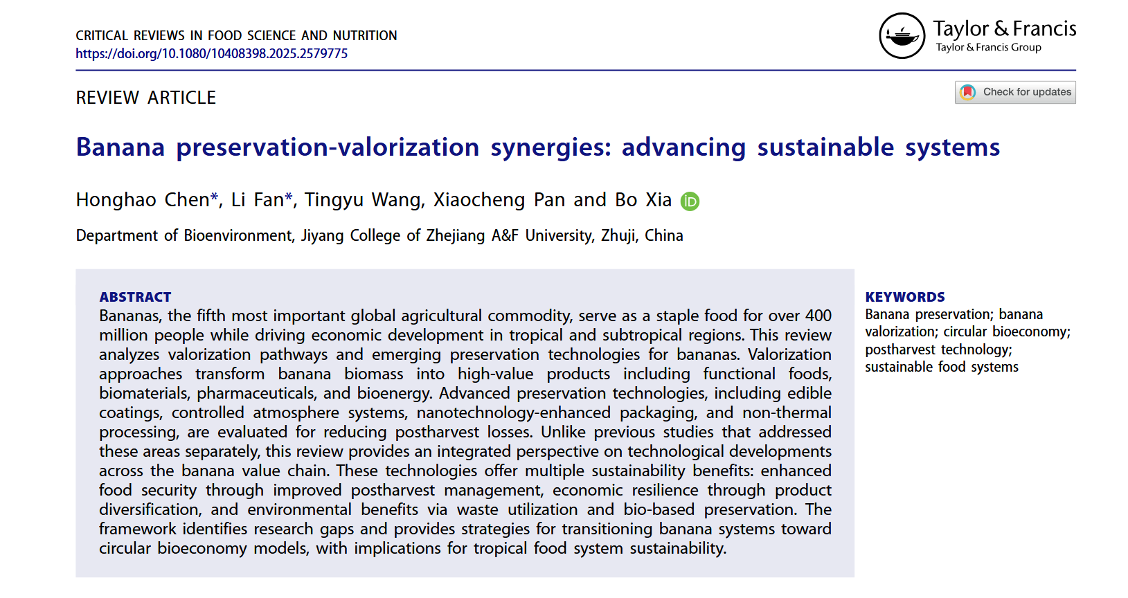 生物环境学院夏波团队在国际顶尖学术期刊《Critical Reviews in Food Science and Nutrition》(IF5-year =12.0)上发表了题为“Banana preservation-valorization synergies: advancing sustainable systems”的重要学术论文。该文深入探讨了通过多样化利用以及先进保鲜策略提升香蕉产业可持续发展的可能性。