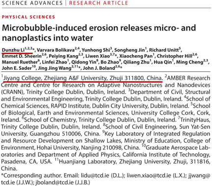 12月18日,李敦柱教授团队在《Science》子刊《Science Advances》(中科院1区Top,IF-5yr=14.1)在线发表题为《微气泡侵蚀塑料基材表面及其驱动微纳塑料释放机理研究》(Microbubble-induced erosion releases micro- and nanoplastics into water)的研究性论文并入选期刊官网封面。聚焦微/纳塑料在水环境中的“源头生成”机制,本研究解析了典型水环境条件下塑料表面自发形成微气泡过程,并揭示其诱导界面侵蚀驱动微塑料与纳塑料释放机制,为准确评估饮用水及天然水体中微/纳塑料污染的形成过程与控制措施提供了理论支撑。