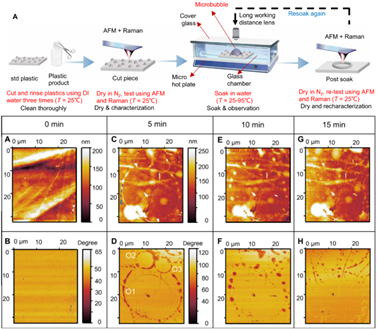 微塑料(Microplastics)及纳塑料(Nanoplastics)释放与控制是当前全球塑料污染研究的焦点。传统观点将微/纳塑料的产生归因于光照老化、机械磨损等高能释放途径。然而现实水环境中,塑料基材往往处于静置浸泡、低剪切流动等相对“低能耗”环境,却仍可能持续释放微/纳塑料颗粒,这提示存在被忽视的低能量生成通道。针对这一科学问题,研究团队系统考察了塑料-水界面微气泡的自发成核与演化过程。结果表明,在25°至95°C等常见温度范围内,塑料表面可自发成核形成微气泡;在气泡的生长-溶解/脱附循环中,微气泡不平衡表面张力会对塑料表面产生持续的局部作用,促使表面微观侵蚀与损伤逐步累积,最终将微塑料与纳塑料释放进入水体。